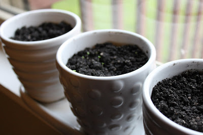 In addition to outside vegetables and fruit, Husband and I are trying our hands at a little indoor herb garden. So far we just have rosemary and thyme planted, but we're looking to expand. The thyme plants are up (I planted them a week ago today also), and they are just the cutest little things you'd ever see.